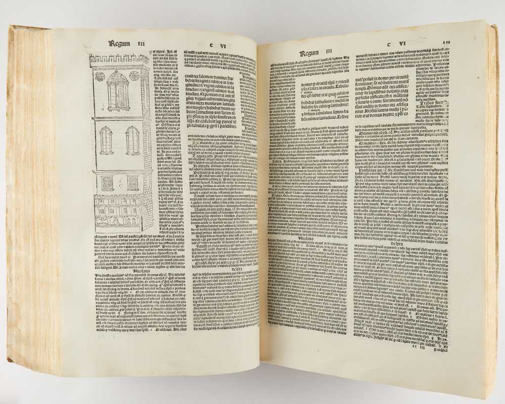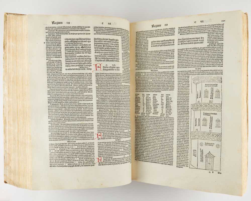 [BIBLIA LATINA.] [Cum glossa ordinaria Walafridi Strabonis aliorumque et interlineari Anselmi Laudunensis et cum postillis Nicolai de Lyra expositionibusque Guillelmi Britonis in omnes prologos S. Hieronymi; Nicolaus de Lyra: Contra perfidiam Judaeorum.] [Venice: Paganino Paganini. 18 April 1495.]