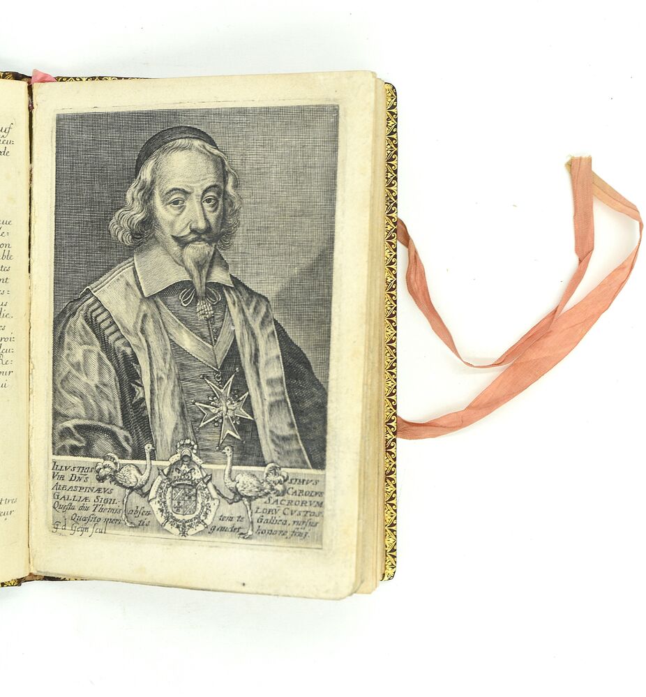 Small 4to. Contemporary French dark red morocco, richly gilt, covers elaborately tooled with pointillé tools in an open fanfare design, within pointillé, double fillet and floral roll tool borders, spine gilt in compartments with raised bands, gilt edges, pink silk ties and place marker, marbled endpapers; ff. [2], 34, pp. 35-39, [1 (blank)], engraved throughout (77 full-page engravings) by Colin and De Gheyn, without title and privilege leaf; two very small holes near hinge of rear board, hinges and extremities very expertly repaired; tiny hole to f. 33 (repaired); “N 686” in ink to recto of f. [1]; a cutting from a catalogue (attributing the binding to “Le Gascon”) to verso of front free endpaper; bookplates of Paul Grandsire to verso of front free endpaper and verso of rear free endpaper (see below).