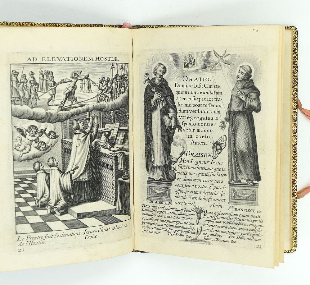 The volume opens with a dedication letter from the printer François Mazot to Charles de l’Aubespine (1580-1653), Marquis de Châteauneuf, ambassador, and later Keeper of the Seals of France, faced by a portrait of the dedicatee by the Dutch engraver Willem de Gheyn (fl. 1650–1670). An engraved title page by Jean Colin (c. 1623–1701) follows, introducing thirty-five illustrations depicting various parts of the Mass. Each illustration is accompanied, on a facing page, by prayers in French and Latin, embellished with full-length portraits of saints, plants, flowers, and insects. The work concludes with four pages of litanies featuring female saints.