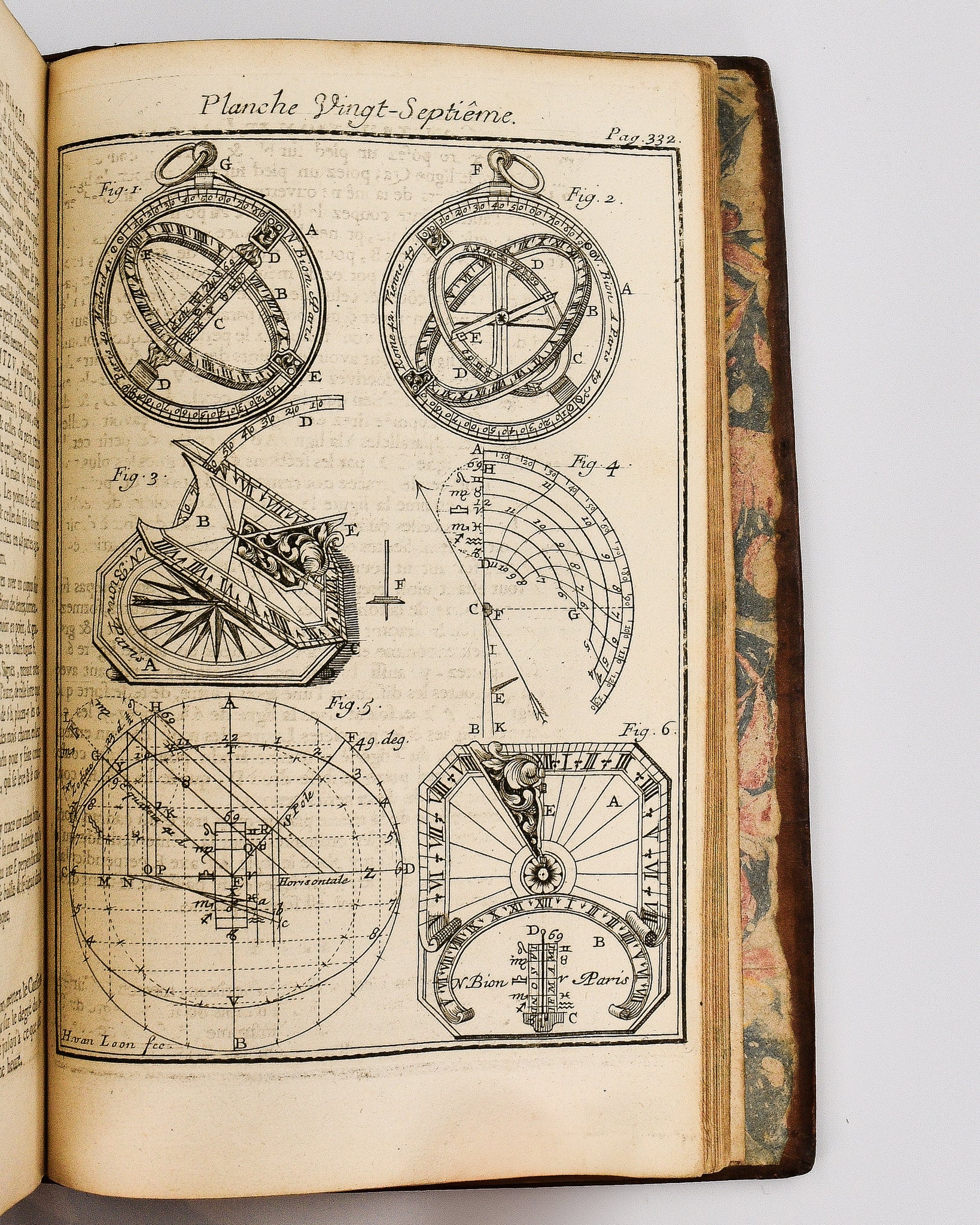 The Traité opens with elementary solid geometry (plates 1-2) and an introduction to the fundamental tools for geometrical drawing – many of which Bion himself manufactured, such as the signed goniometer illustrated on plate 3. Each instrument is treated systematically under the headings “Construction”, “Usage”, and “Example”. Among the many instruments described and illustrated are the sector (plate 6), portable sundials (plate 27), and water clocks (plate 28).