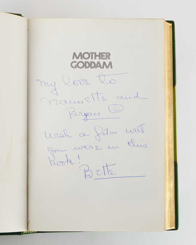 8vo. Finely bound in half green morocco by Asprey & Co., spine lettered and panelled in gilt, all edges gilt; marbled endpapers; pp. [8], 374 (with in-text photographs throughout), [4, (blank)]; spine very lightly faded, slight markings to upper board’s leather panel to spine, fading to cloth; near fine; authorial inscription “My love to | Nanette and | Bryan [smiley face]. | Wish a film with | you were in this | book! | Bette” in blue ink to half-title (see below), bookplate of Brian Forbes to the front pastedown.