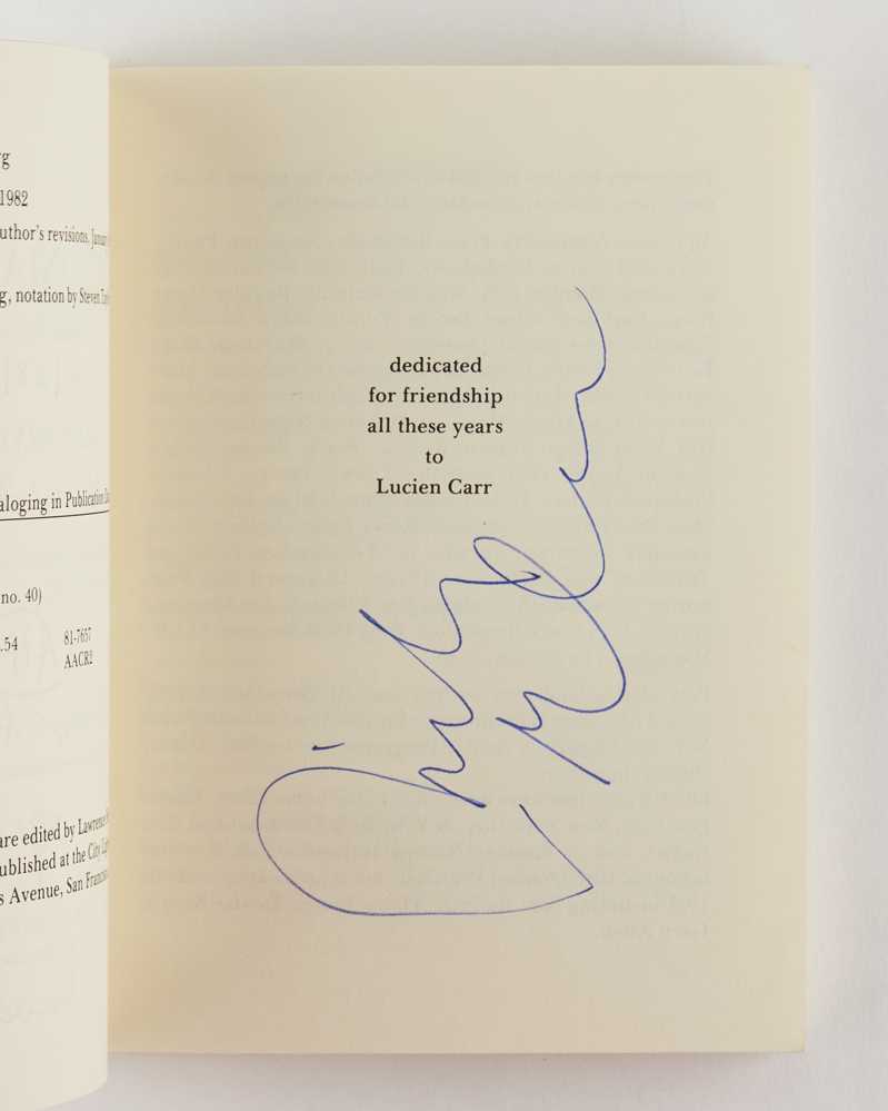 First paperback edition, inscribed by Ginsberg to Terry Arouran, dated 6/28/96 at Boulder. This copy additionally signed by Philip Glass, who wrote his Symphony No. 6 based on this poem. Partly sung by the soprano soloist, the symphony is in three movements, following the structure of the original. It was commissioned by Carnegie Hall in honour of Glass' sixty-fifth birthday and as a vehicle for the talents of soprano Lauren Flanigan, premiering on 2 February 2002, at Carnegie Hall with Dennis Russell Davies conducting the American Composers Orchestra.
