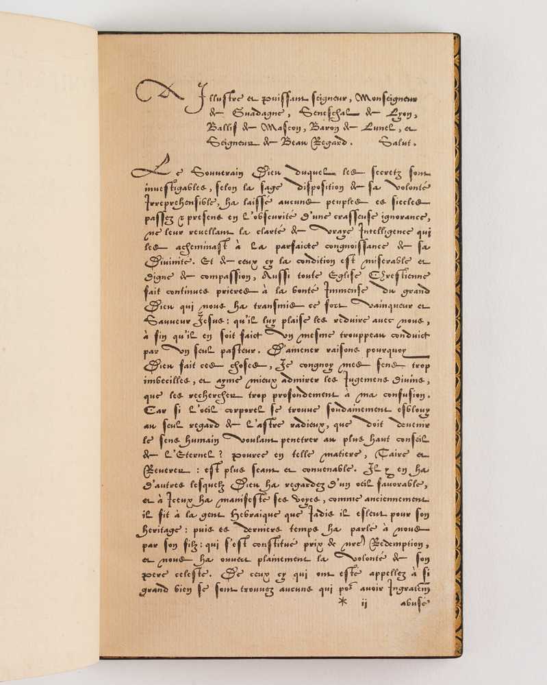 In 1557, Guéroult partnered with the renowned Lyon printer and punchcutter Robert Granjon (c. 1513-1590), and in 1558 they published the first French translation of On Incredible Things. Guéroult’s translation, in prose, is followed by ten original poetic pieces, including sonnets and odes addressed to contemporary figures such as the poets Joachim Du Bellay (c. 1522-1560) and Étienne Jodelle (1532-1573). The volume is printed entirely in Civilité type, a cursive gothic script invented by Granjon and licensed in 1557, making it one of the first ten books issued in this typeface. The Civilité type was designed to imitate contemporary French handwriting and originally intended for use in books for children. Its name derives from La civilité puérile (Granjon, 1558), a children’s courtesy book based on Erasmus’s De civilitate morum puerorum. Between 1557 and 1562, Granjon published around twenty editions in Civilité. The typeface, which was imitated and adapted as early as the late 1550s, enjoyed popularity across Europe well into the nineteenth century.
