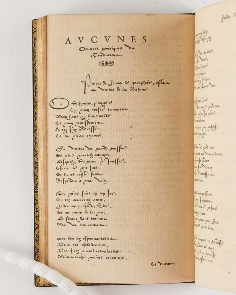 Small 4to. Late 19th-century dark blue Jansenist morocco by Chambolle-Duru, spine lettered directly in gilt, gilt turn-ins, gilt edges, marbled endpapers; ff. [4], “lix” (i.e. lx), woodcut printer’s device to title, woodcut head- and tailpieces; very light rubbing to spine and corners; very subtle, small restoration to lower outer margins of ff. *1-e4, h1-3, p1-4 (not affecting text), otherwise in excellent condition, small bookplate “Ex Libris Jean Bourdel” loosely inserted.