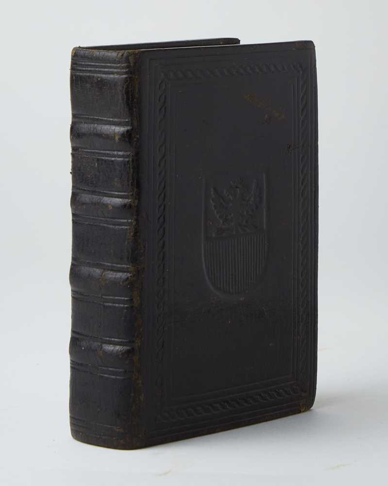 Manuscript on vellum, 95 x 70 mm. 19th-century dark brown morocco, blind armorial supralibros within rope border to centre of covers, blue silk doublures, housed in a modern custom-made black cloth box; ff. ii, 144, ii: 1-28, 3-810 (f. 31 in 4, apparently in original condition on a stub and with outer edge made-up), 98, 10-1510, complete, catchwords in lower margins of final versos, guide letters visible, foliation in black ink in upper corners from second to final flyleaves 1-146 (two leaves numbered “98” as also “136”) followed here, 11 lines neatly written in black ink in a round gothic bookhand between two verticals and twelve horizontals ruled in brown, justification: 60 x 45 mm, rubrics in red, text capitals touched yellow, one-line initials in alternate blue and red, two-line initials of liquid gold on grounds of green, red or blue with scrolling decoration, large illuminated 7-line initial “S” (f. 31v) enclosing Virgin and Child, initial entwined by elaborate foliage, painted in green and blue, heightened in gold, and set against a magenta ground, with accompanying panel border including jewels and pearls, and large 5-line historiated initial “D” (f. 86) painted magenta and green including jewels and pearls, against blue and gold ground, with matching full-page partial border; extremities of binding very lightly rubbed; a little smudging to page with historiated initial, occasional small stain, but generally very well preserved; title to second front flyleaf and ownership inscription to lifted rear pastedown in a single 19th-century hand in black ink, modern bookplates to front flyleaf and inside upper cover (see below).
