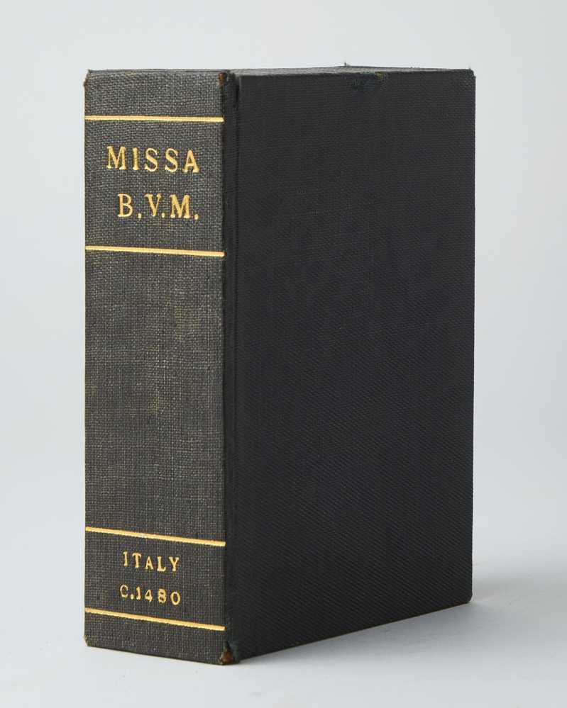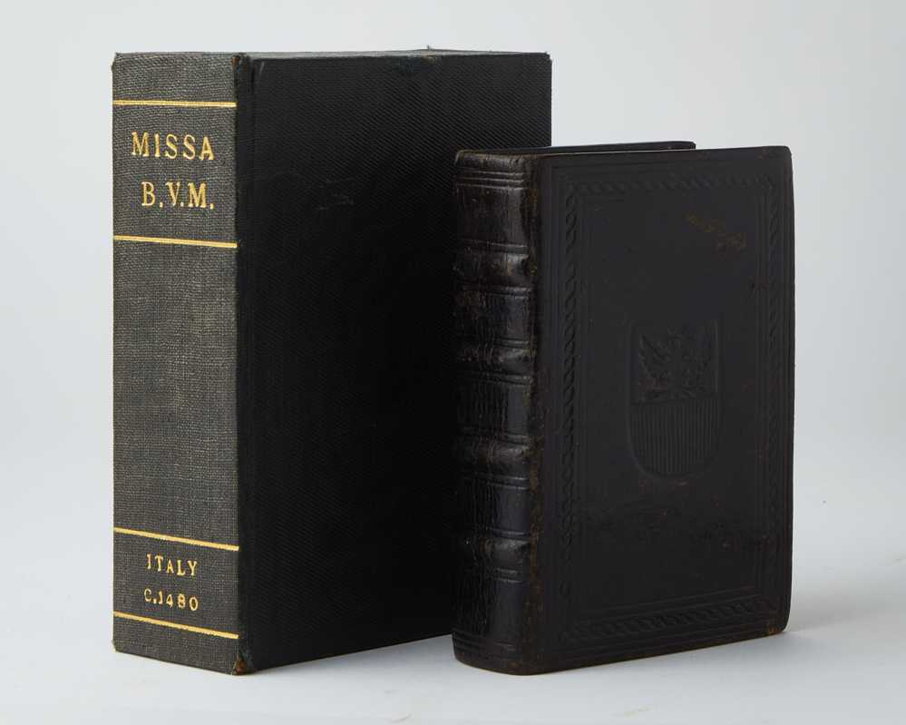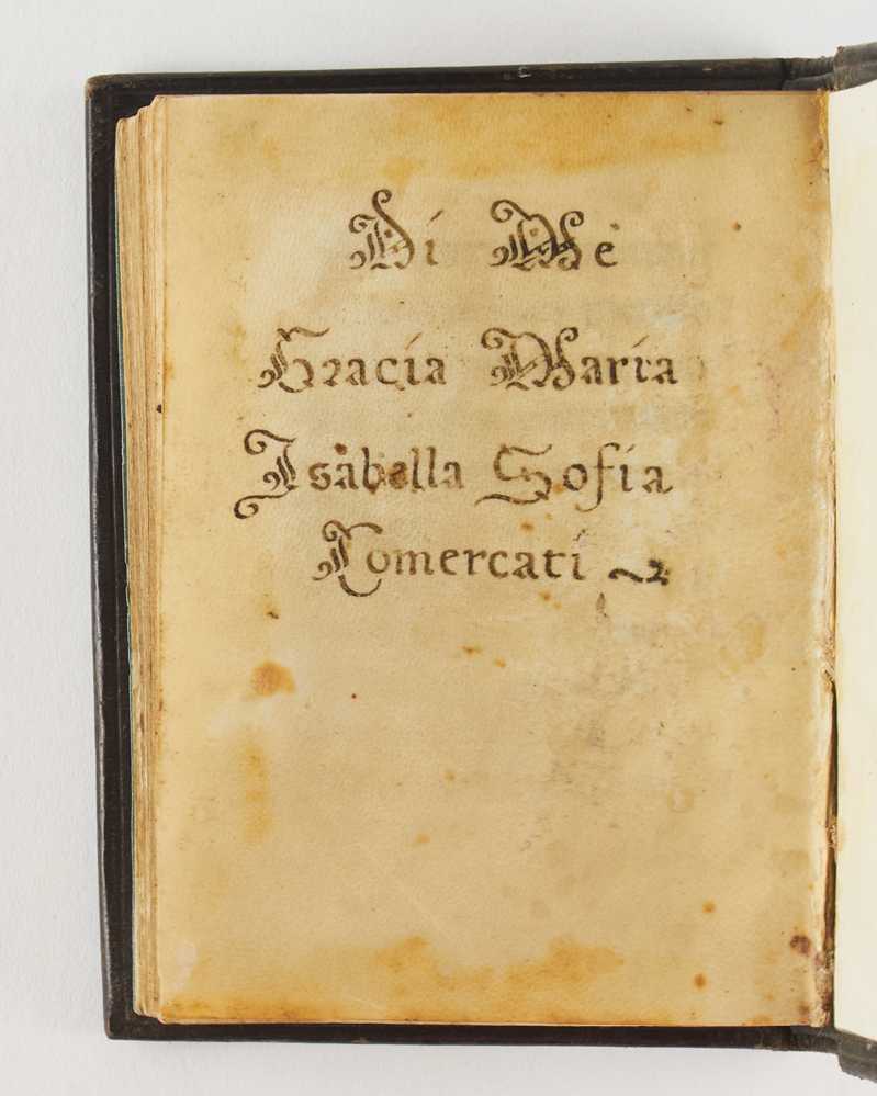 2. Nineteenth-century manuscript title “Missa Beatae Virg. & aliae Orationes” on the second front flyleaf and ownership inscription, “Di Me Gracia Maria Isabella Sofia Comercati”, on the lifted rear pastedown, likely contemporary with the present armorial binding (arms unidentified).