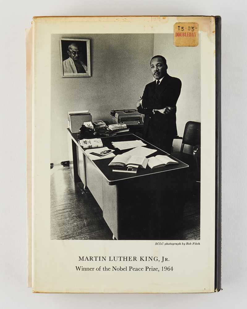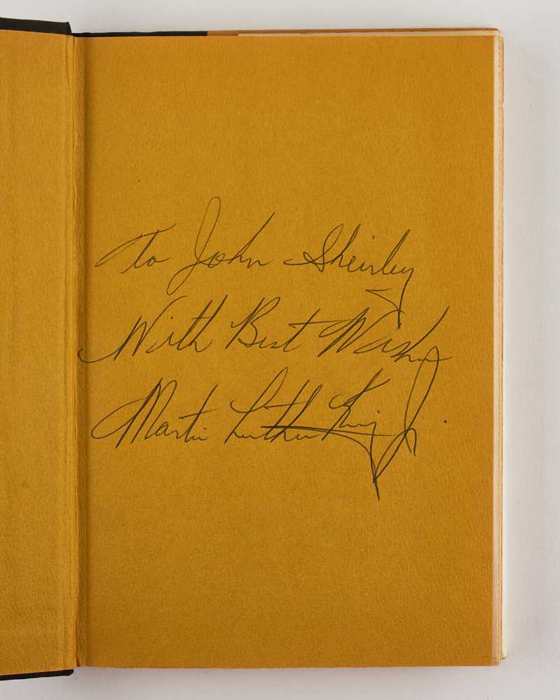 8vo. Original black cloth-backed yellow boards, gilt lettering to spine, with illustrated dustwrapper; pp. [viii], 209; dustwrapper slightly dampstained to head of spine, generally very good; presentation inscription “To John Shirley/ With best wishes/ Martin Luther King Jr” to front free endpaper; with loosely inserted: Order of service for Ebenezer Baptist Church, 2 July 1967 (8 pp.); Order of service for St Paul’s Cathedral, Evensong (4 pp., featuring a sermon by King’s wife Coretta), 16 March 1969; A3 sheet of three photocopied stories in The Times and The Sunday Times from 1968 by Shirley regarding King, his legacy and the civil rights movement (see below).