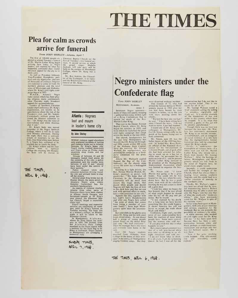 The Ebenezer Baptist Church order of service is from that meeting, while the book, which had only just been published, was likely presented to Shirley on the same day. The Times cuttings represent his journalistic output during early 1968 in the aftermath of King’s assassination. He was instrumental in spreading the legacy of Martin Luther King to British shores.