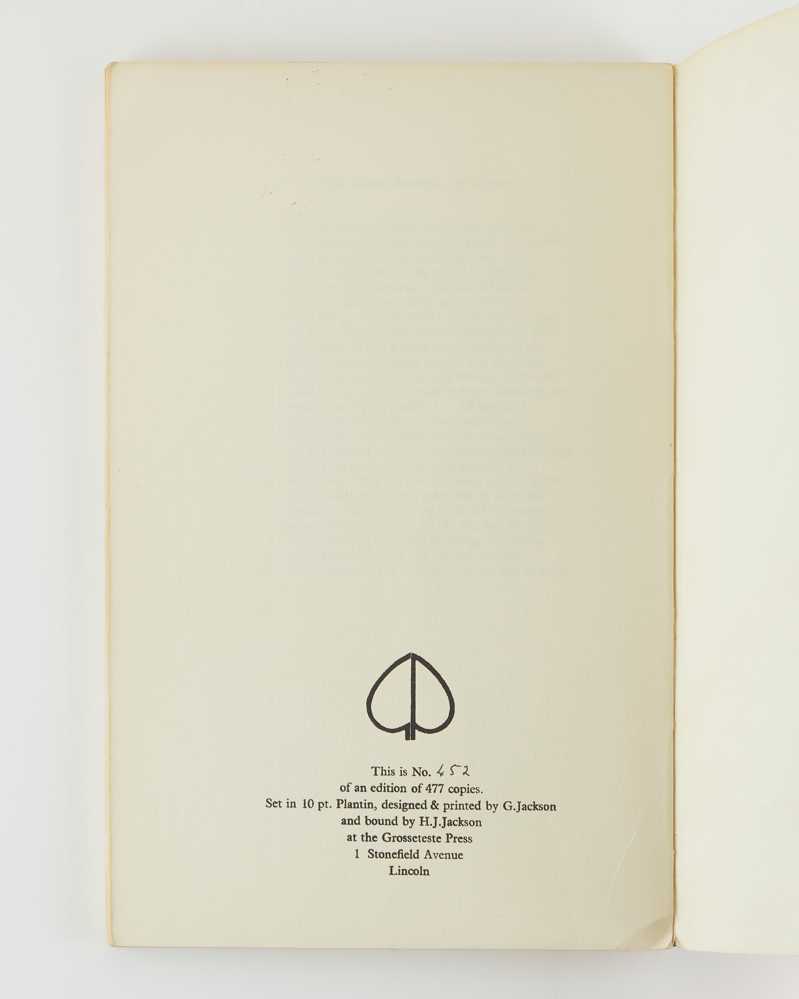The book was issued in an edition of 477 numbered copies in wrappers, and an unknown quantity of the hardback variant. A lettered edition of 26 copies, printed on tinted paper, also in 1969, was not issued until the 1990s, when the sheets were bound in green buckram and sold by Peter Riley. Clean, bright copies in any format are increasingly elusive.