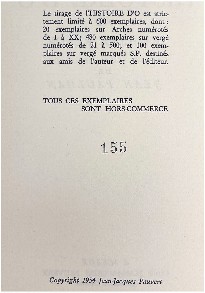 REAGE, Pauline [pseudonym for Anne DESCLOS]. Histoire d'O. Paris: Jean-Jacques Pauvert. 1954.