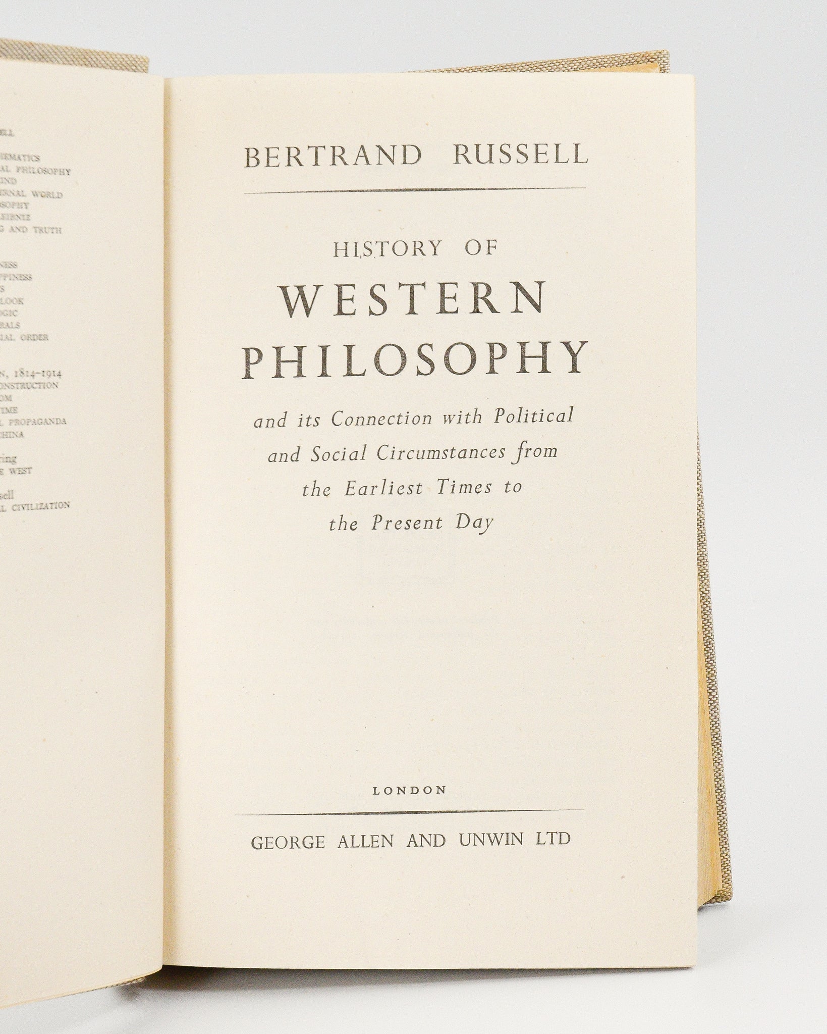 RUSSELL, Bertrand. History of Western Philosophy: And its Connection with Political and Social Circumstances from the Earliest Times to the Present Day London: George Allen and Unwin Ltd. 1946.