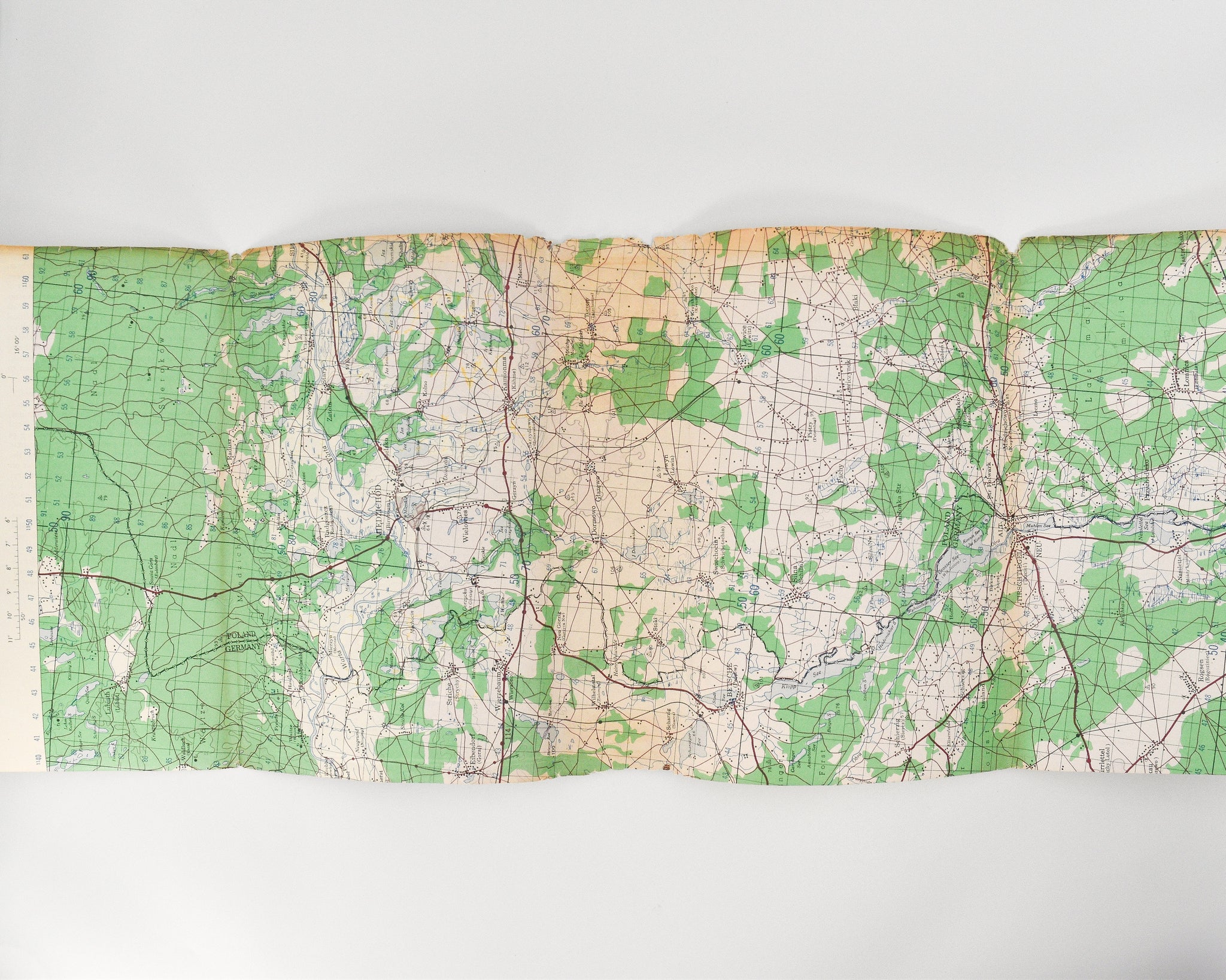 The first edition is, appropriately, printed in conformity with war economy standards, and famously repurposes surplus wartime maps for the dustwrappers, this copy showing a cross-section of Germany and Poland, including the towns of Międzychód (German: Birnbaum), where most of the Polish residents were expelled as part of the “Heim ins Reich” program pursued by Hitler before and during the war, and Trzciel (German: Tirschtiegel), home to an extended Jewish community from the eighteenth century until the events of the mid-twentieth century, when the population dropped markedly. November 9, 1938, saw a Pogrom in Trzciel during which “rioters torched the synagogue and demolished the town’s last Jewish owned house.” During the war, the Germans established a forced labour camp for Jews in the town. In 1945, Trzciel was captured by the Soviets. Eventually the town was restored to Poland and the remaining German population expelled.