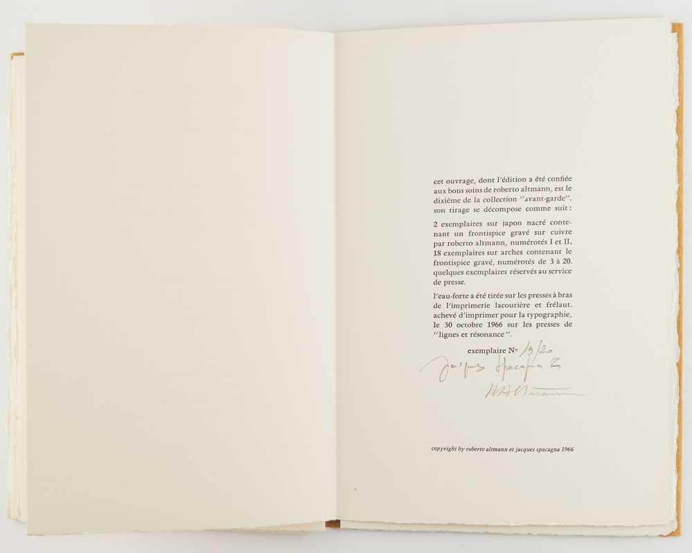 This copy is numbered nineteen out twenty to the limitation page. This is one of eighteen copies on Arches (another two were produced on Japon Paper). The book is also signed to the limitation page in pencil by the Spacagna and Altmann.