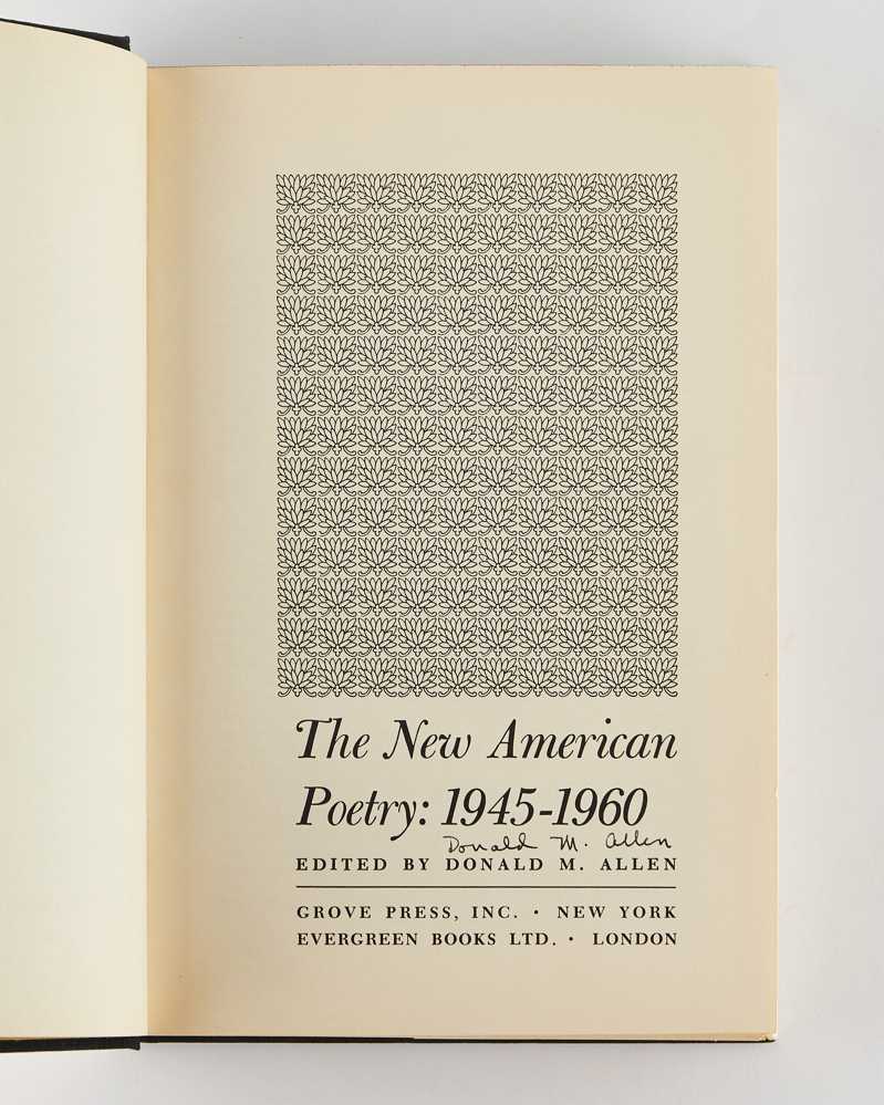 8vo. Publisher's black cloth, spine and upper board lettered in gilt; in the original illustrated dust wrapper (not price-clipped); top edge blue, mustard endpapers; pp. xxiv, 454, [2]; slight toning to wrapper, with a few nicks and light rubbing to extremities; signed without dedication by Donald Allen to the title page, with laid in contract signed by the editor and Allen Ginsberg; internally bright and clean, a fine copy in very good wrapper.