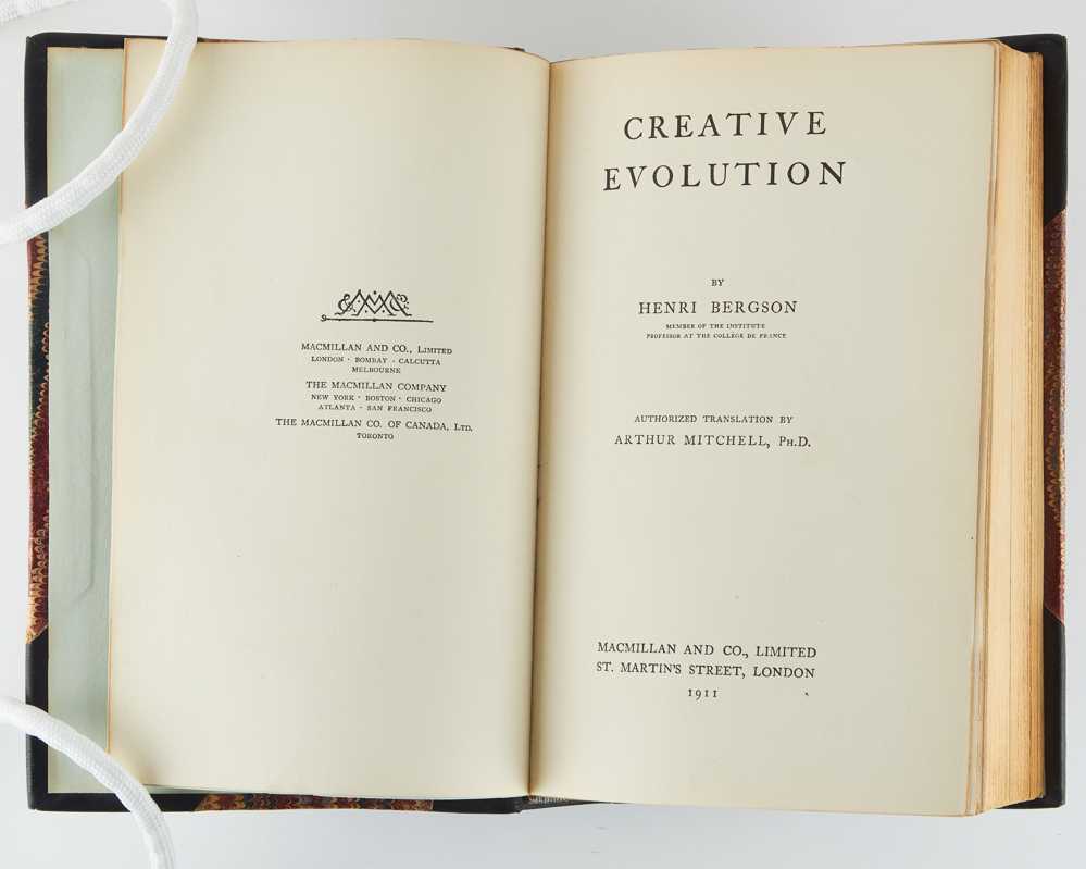 First English edition. Translated by Arthur Mitchell. In this book Bergson offers an alternative to Darwin's natural selection. In Bergson's system, a "vital impulse" - our own creativity - spurs humanity on towards progress and the development of the individual intelligence. Though this work is grounded in biological science, Bergson's conclusions are very much drawn from his wider philosophy. His thoughts on time as a subjective rather than objective reality were more influential on Modernist writers such as Mann and Proust than on scientists. It was a fashionable book in its day and was the main work upon which Bergson's 1927 Nobel Prize in Literature was based.