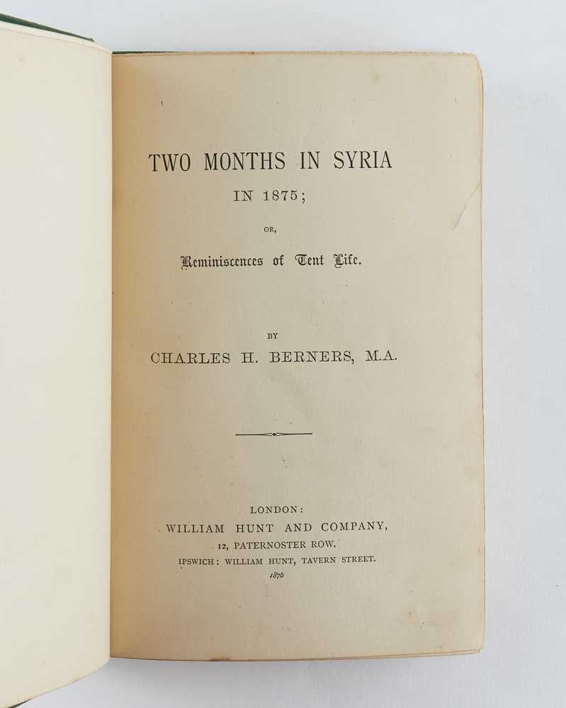 BERNERS, Charles Hugh. Two Months in Syria in 1875; or, Reminiscences of Tent Life. London: William Hunt and Company. 1876.