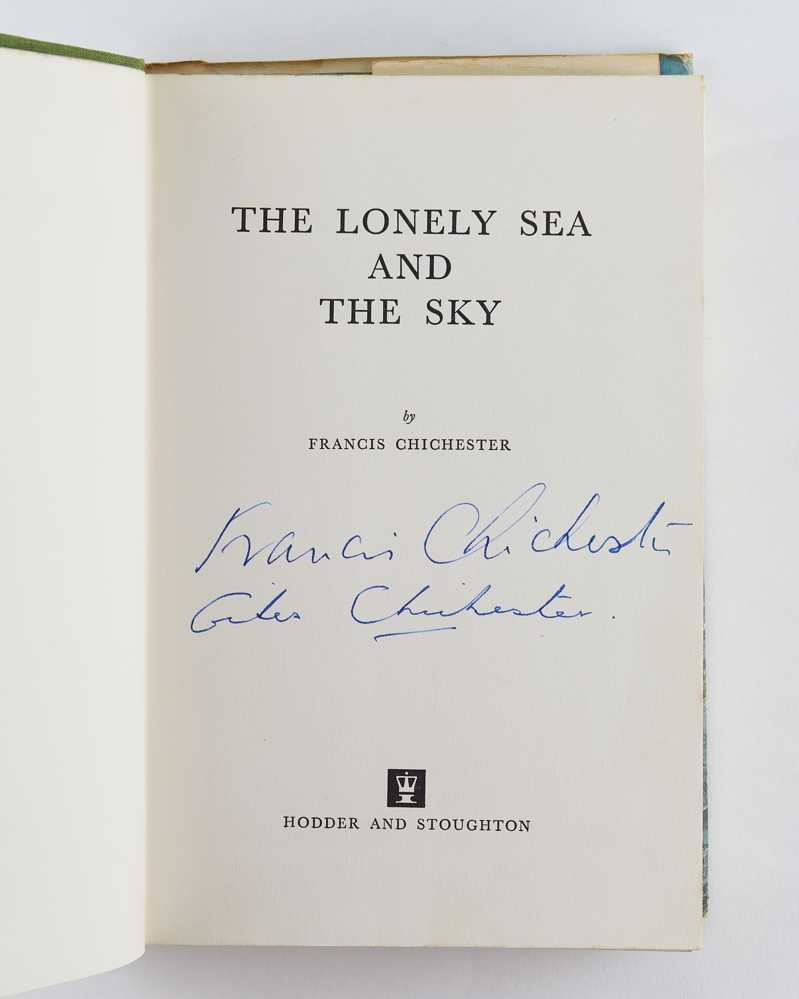 First edition, first printing, signed by both the author and his son Giles on title-page. The autobiography of the navigator, aviator, sailor, and navigational scientist for both aviation and ships. 'Chichester used his navigation experience to create a successful map-making company, Francis Chichester Ltd, which today still publishes pocket guides and maps which are sold throughout the world' (Pan-Macmillan, online). His son Giles, a Conservative politician, has been working since 1969 in the family business.