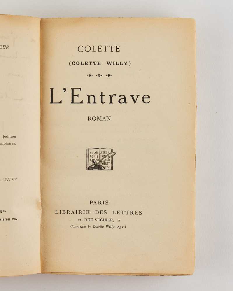 "COLETTE" (i.e. Sidonie-Gabrielle COLETTE). L'Entrave. Paris: Librairie des Lettres. 1913.