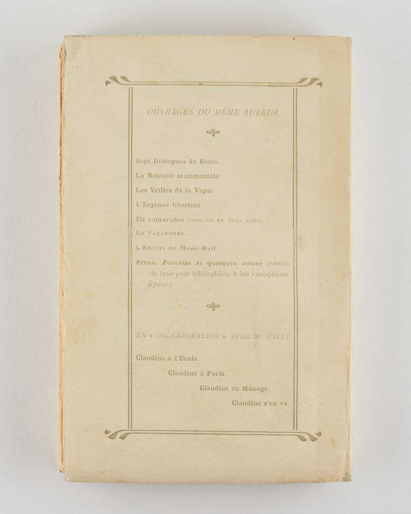 8vo. Original cream wrappers printed in black and red, uncut, preserved in a modern cloth slip-case; pp. [4], 307, [1]; light marginal water-staining, mostly at the beginning, hinges reinforced, but overall a remarkably good copy; authorial inscription to half-title in ink: “A Georges Abric en témoignage d’une grande sympathie, Colette de Jouvenel” (see below).