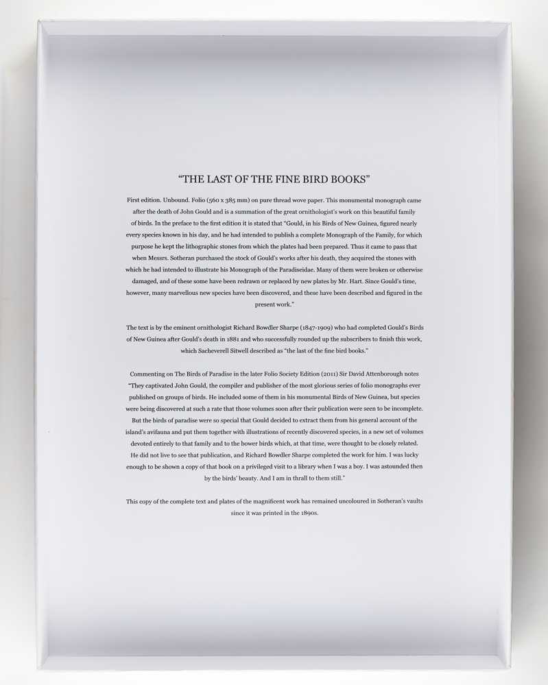 The text is by the eminent ornithologist Richard Bowdler Sharpe (1847-1909) who had completed Gould's Birds of New Guinea after his death in 1881 and who successfully rounded up the subscribers to finish this work, which Sacheverell Sitwell dubbed "“the last of the fine bird books". Sharpe best tells the story of the genesis of the work in his preface: "Gould, in his Birds of New Guinea, figured nearly every species known in his day, and he had intended to publish a complete Monograph of the Family, for which purpose he kept the lithographic stones from which the plates had been prepared. Thus it came to pass that when Messrs. Sotheran purchased the stock of Gould's works after his death, they acquired the stones with which he had intended to illustrate his Monograph of the Paradiseidae. Many of them were broken or otherwise damaged, and of these some have been redrawn or replaced by new plates by Mr. Hart. Since Gould's time, however, many marvellous new species have been discovered, and these have been described and figured in the present work"