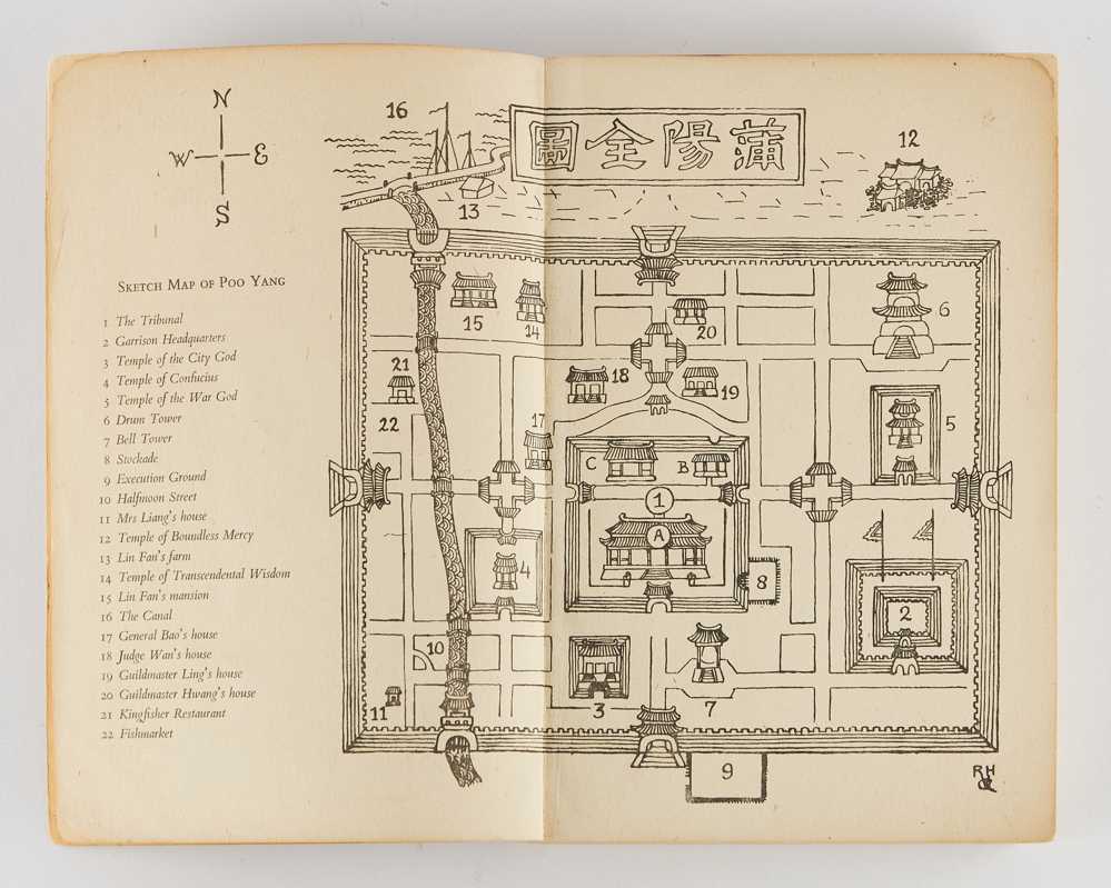 8vo. Publisher’s soft cream card covers lettered in black to front cover and spine, illustrated endpapers reproducing a map of Poo-Yang; publisher’s label “PROOF COPY for inspection” pasted to front cover, with “PROVISIONAL publication date March 3rd 1958” and “PROVISIONAL price 13/6” noted, front cover stamped “17 FEB 1958”; pp. [4], 288 , [4], with 15 plates drawn by the author “in the Chinese style”; covers and spine lightly worn and creased, slightly soiled, titles on front cover partly retraced in pen, old bookseller’s price in black ink to front free endpaper; very good.