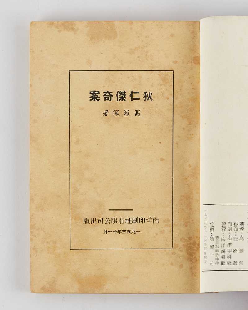 GULIK, Robert van (author and translator). Ti-Jen-Chien-Ch’i-an [The Strange Cases of Detective Dee: The Chinese Maze Murders]. Singapore: Nan-yang-yin-shau-she [Nanyang Commercial Press]. 1953.