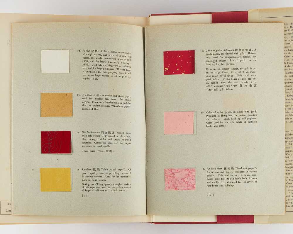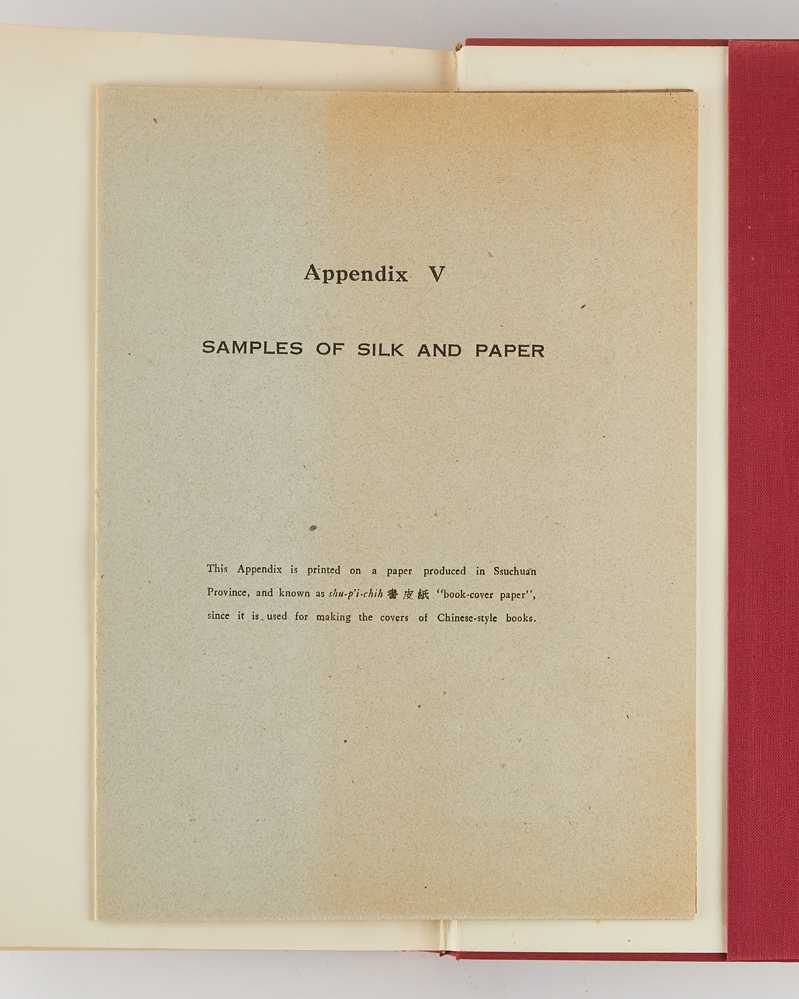 4to. Publisher’s red cloth, lettered and ruled in gilt to boards and spine; illustrated dust jacket with woodcut seal and calligraphy by the author; pp. xxxvii, frontispiece, [3], 537, [1 (blank)], with 160 plates; cloth pocket to rear pastedown containing the original supplementary booklet (12 pages) with 42 mounted samples of Japanese and Chinese paper; jacket torn and chipped with old repair reinforced by a paper backing to the reverse, corners and spine slightly bumped, foxing to prelims and edges of text block, light occasional foxing internally; previous bookseller’s label to rear endpaper; very good; ownership signature of Sherman E. Lee in black ink to upper left corner of front pastedown (see below).