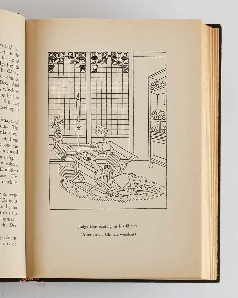 8vo. Original woodcut-illustrated boards showing Judge Dee, with the original blank dust-jacket (the typed title to the spine likely added by a later owner); pp. [10], xxiii, [1 (blank)], 237, [3 blanks], with woodcut frontispiece and 3 reproductions of original Chinese illustrations and 6 plates by the author; light wear to board edges and spine tips, minor rubbing to ink on upper cover, otherwise exceptionally bright and well preserved; author’s signature in black ink and red ink stamp to limitation page (see below); bookplate of Basil W. R. Jenkins to verso of front free endpaper; near fine.