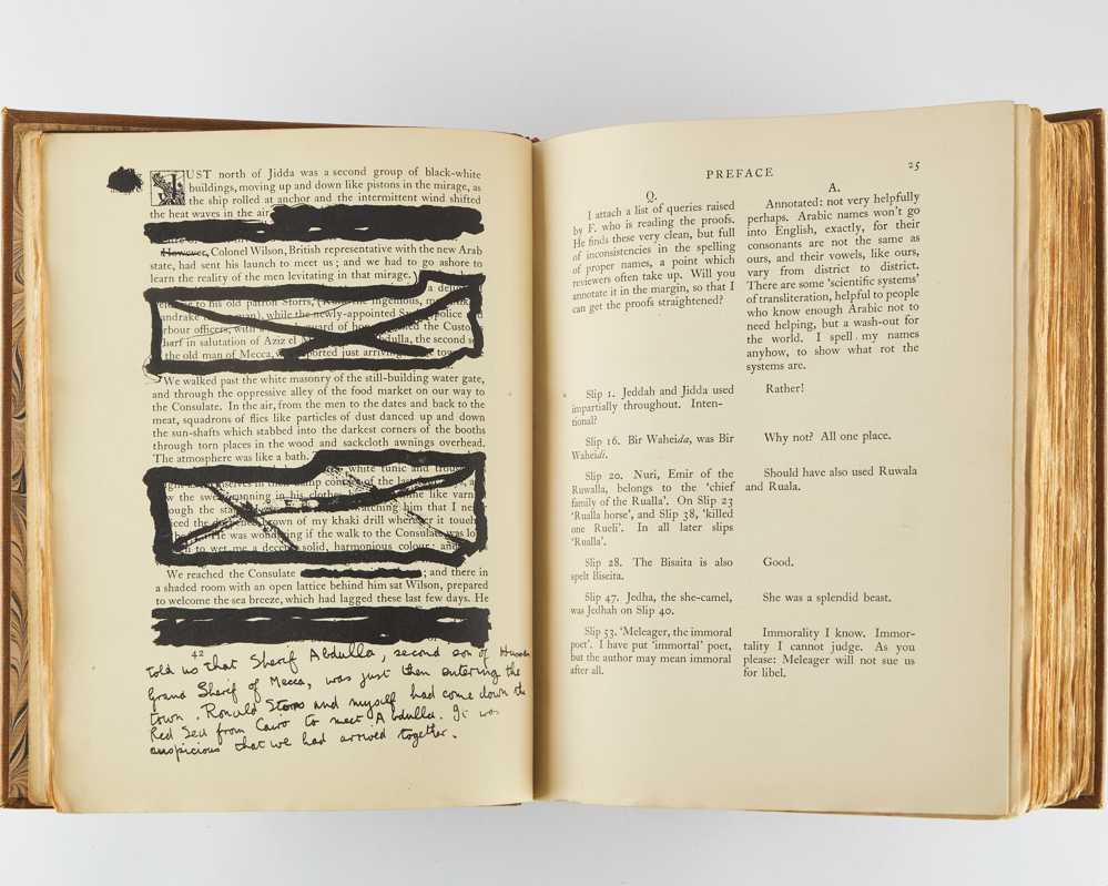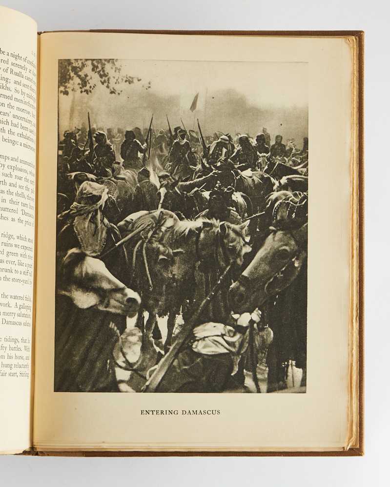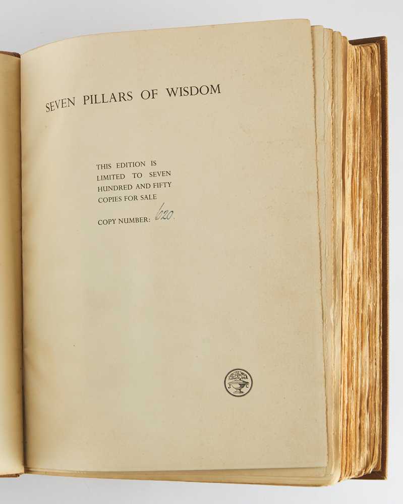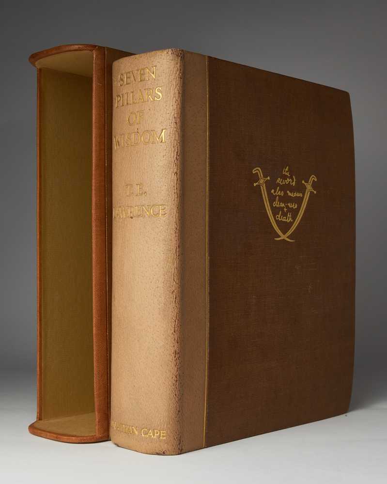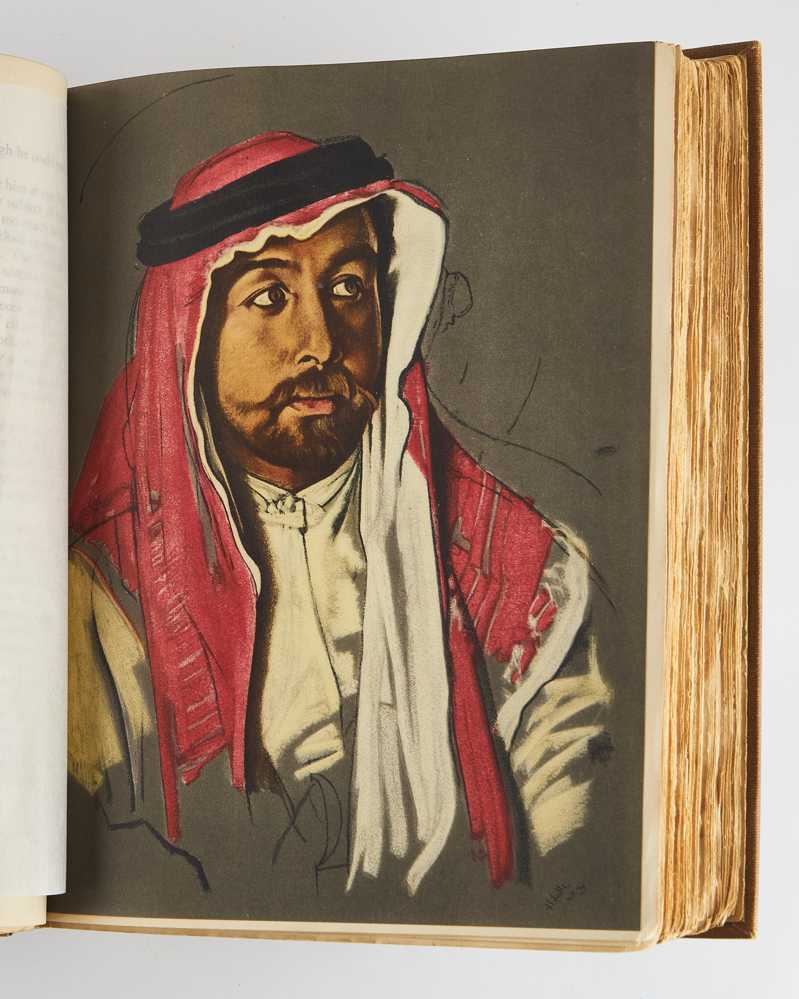 4to. Original pigskin-backed brown buckram, spine lettered in gilt, upper board blocked in gilt with crossed sword design, top edge gilt, others uncut, marbled endpapers, housed in a matching contemporary quarter calf slipcase; pp. 672; frontispiece and 47 photogravure plates by John Swain & Son after Augustus John, Eric Kennington, Lawrence, and others (four in colour), four folding maps printed by The Chiswick Press, Ltd in red and black and bound to throw clear, three facsimiles (one double-page, all captioned in red print on versos); minimal fading and light rubbing to binding; internally very good.
