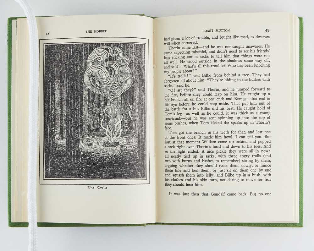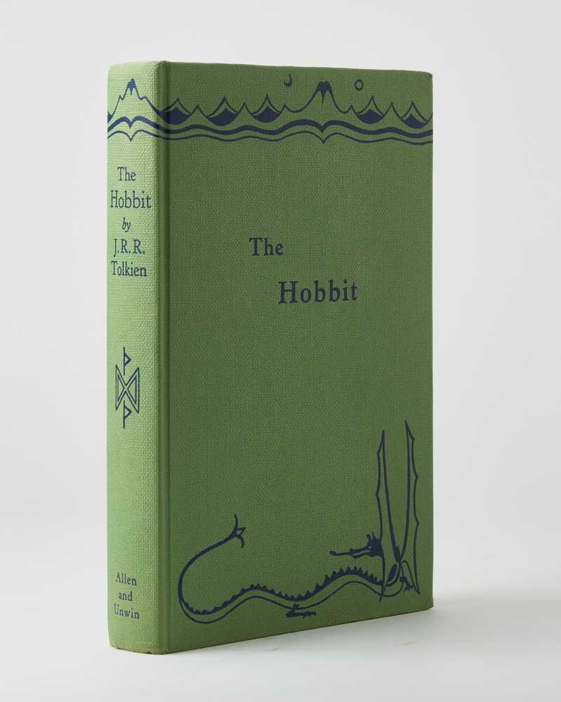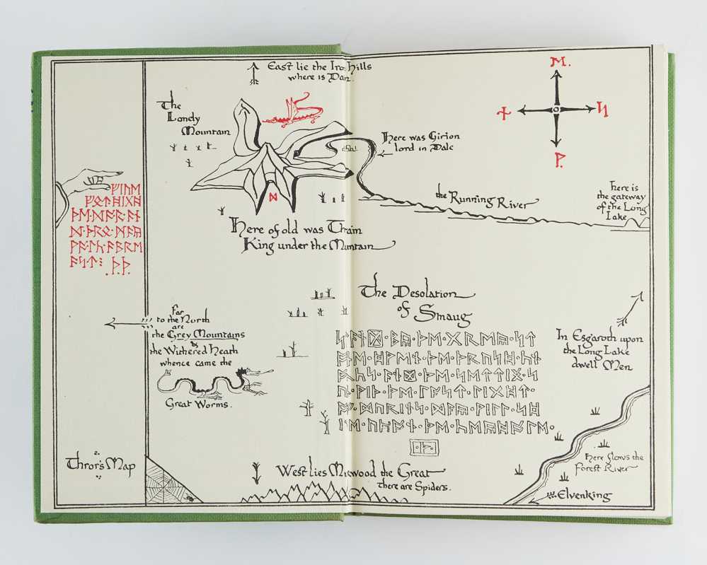 8vo. Original green cloth-textured paper over boards, title in dark blue to front panel between wraparound decorations by the author (also dark blue). Illustrated map endpapers: Thor's Map to front, Wilderland to rear; dustwrapper with wraparound illustration by Tolkien, in black, green and blue, of the Lonely Mountain and neighbouring mountains and forest, runic inscription to upper and lower edges; pp. 320, 4 coloured plates (including frontispiece), black and white illustrations throughout; boards lightly bumped to three outer corners, minor pushing and fading to lower spine tip, a touch of rubbing to upper spine tip; an exceptional copy, fine and bright, pages and wrapper crisp and clean.