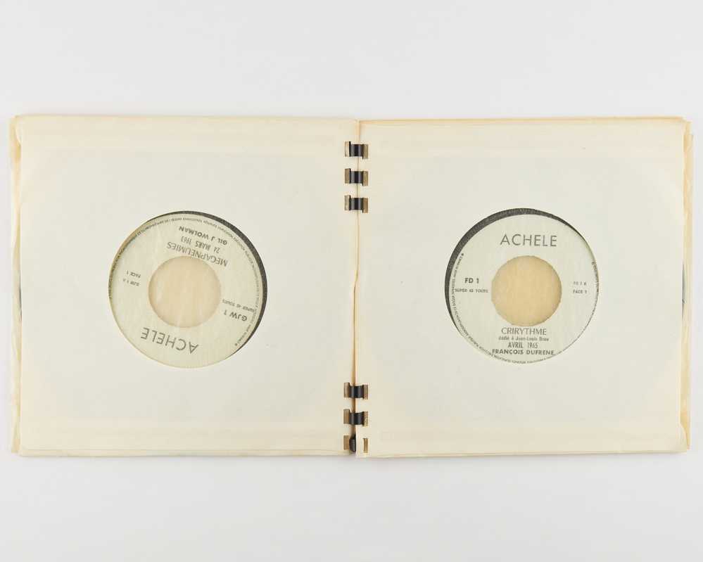 A complete set of the three artist records published by Wolman in response to Henri Chopin’s OU Magazine. Each record is devoted to a single artist. There are two variant forms that can be found of this publication. Some are in a deluxe edition which has a series of original artworks, or similarly to this copy, have the original spiral binding. This copy is particularly rare due to the handwritten cover by Dufrêne which lists the title along with the artists in bold red felt-tip pen.