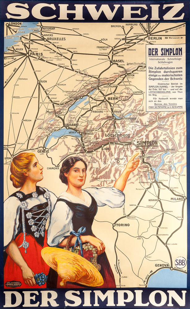 ANON. Schweiz - Der Simplon. Original lithograph with colour, published by Schweizerische Bundesbahnen (SBB), printed by Ateliers artistiques A. Denéréaz-Spengler & Co, Lausanne, Switzerland, 1918. 1030 x 640 mm.