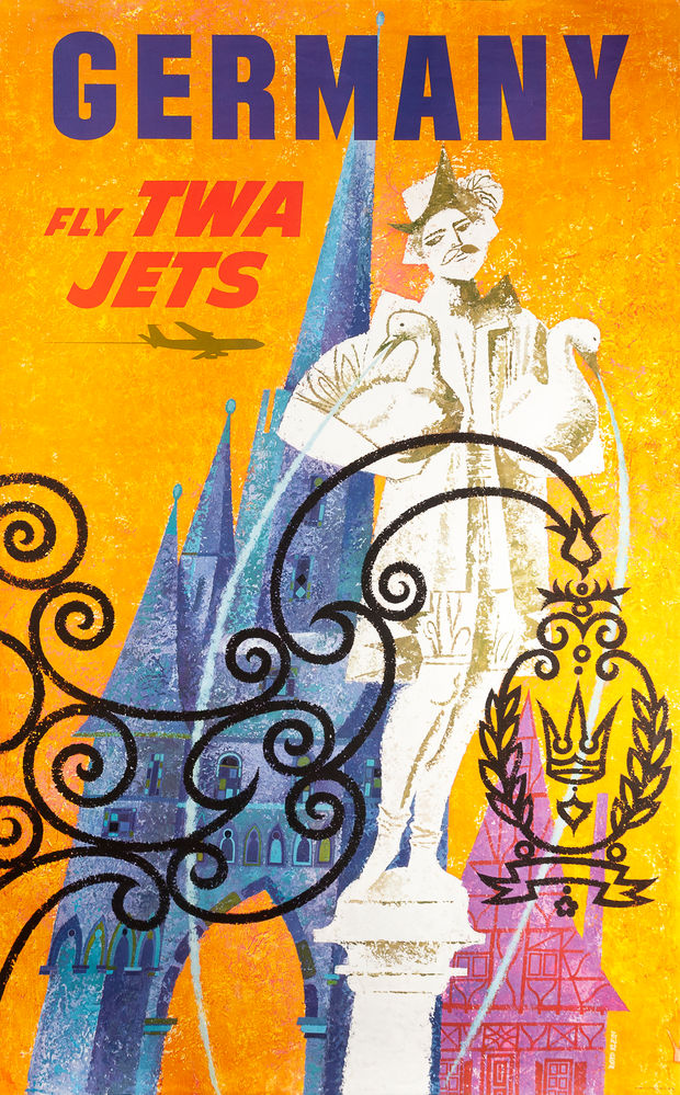 KLEIN, David (1918-2005). Germany Fly TWA Jets. Original lithograph with colour, printed in U.S.A, c.1960. 1020 x 630 mm.