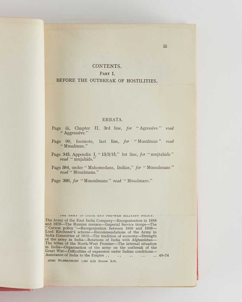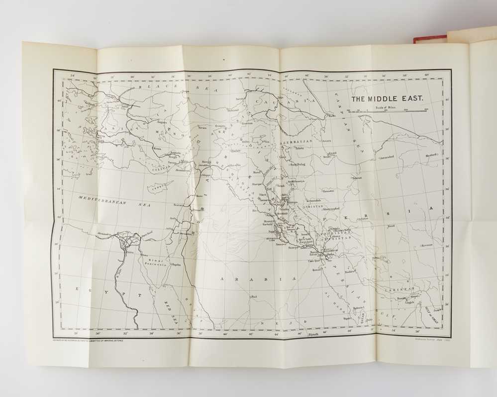 First editions of all volumes, with errata slip in volume one. This, the most comprehensive - if biased - account of the First World War in Iraq, or the Mesopotamian Campaign, was researched and written by Brigadier James Frederick Moberly, who was born in 1867 in Madras and became a leading military historian. The four volumes, published in the series History of the Great War, cover and illustrate the Turkish province before the war, the Indian Army, the decision to invade, the capture of Basra, Turkish counter attacks, the British advance on Baghdad, reorganisation of the British forces after the siege and fall of Kut, and the eventual capture of Baghdad. The set concludes with British and Indian operations in Persia, Kurdistan and the Caspian Sea in campaigns against the Bolsheviks under General Dunsterville. A complete set of this exhaustive military history of Iraq from 1914 to 1918 is rarely seen.