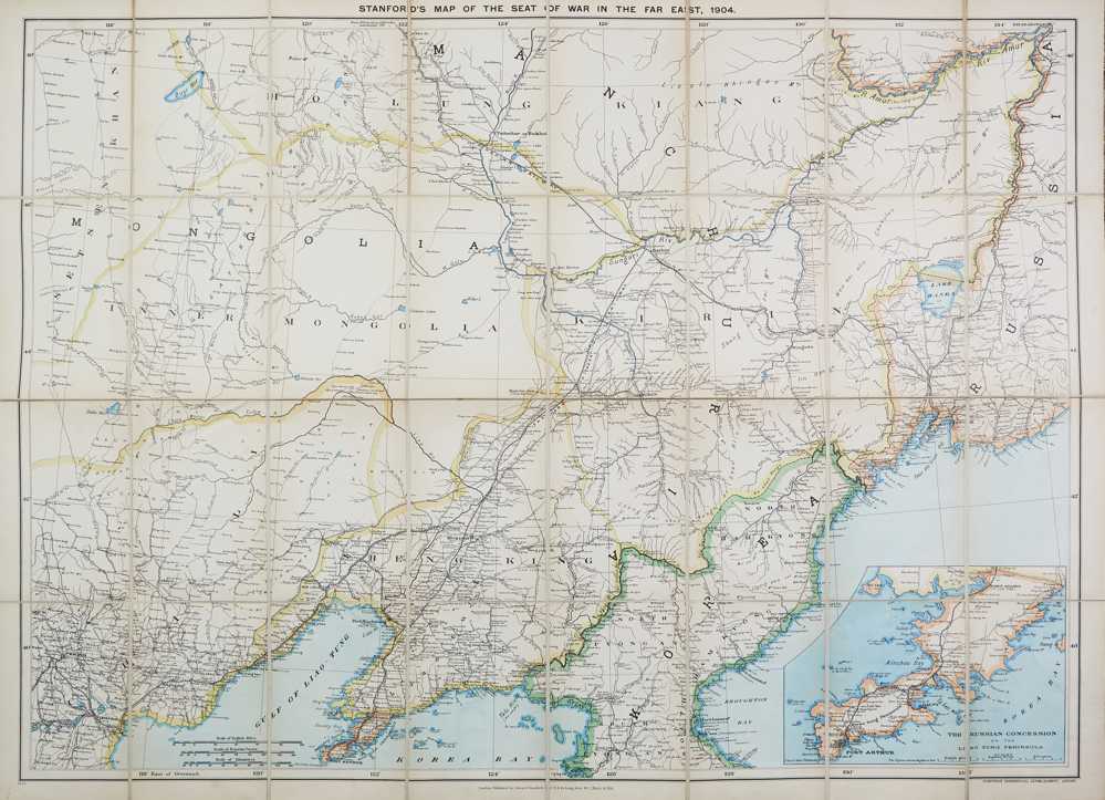 First edition. The inset map shows The Russian Concession on the Liao Tung Peninsula. The transport links (rivers, railways, the Trans-Siberian in particular), are boldly printed. This is one of the best and rarest Russo-Japanese War maps covering the entire region affected by the conflict, from North Korea to just south of Khabarovsk, and Beijing to Vladivostok, including large parts of Mongolia.