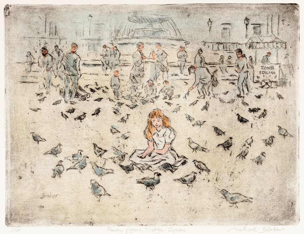 BLAKER, Michael. Feeding Pigeons, Trafalgar Square. Original contemporary hand-coloured etching, signed by the artist and editioned 1/100. 280 x 355 mm.