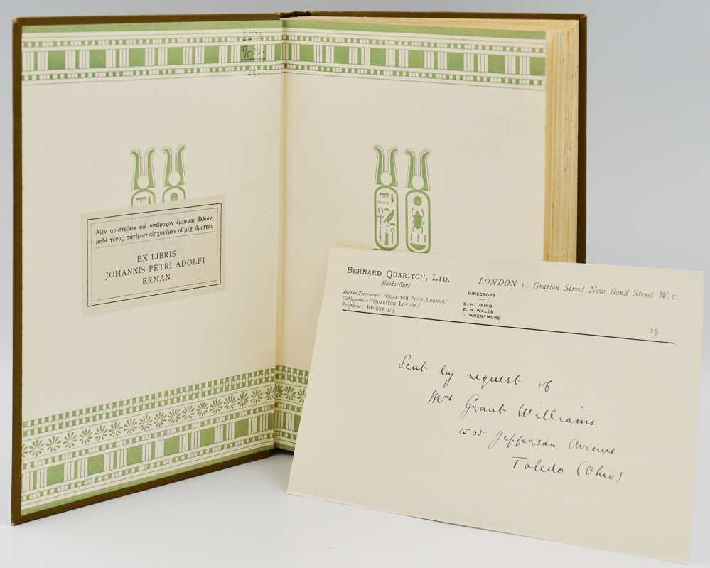Provenance: From the library of Adolf Erman, one of the foremost scholars of Ancient Egypt, responsible for placing the study of ancient Egyptian language upon a scientific basis. The set was purchased from Bernard Quaritch Ltd in the 1930s by Caroline Ransom Wiliams (1872-1952), American Egyptologist and pioneering female archaeologist, and one of Erman’s students in Berlin. Through the course of many years, their relationship would blossom from teacher and pupil to close colleagues and friends.