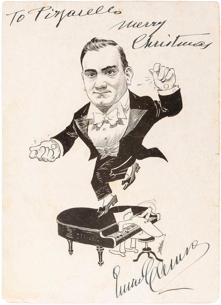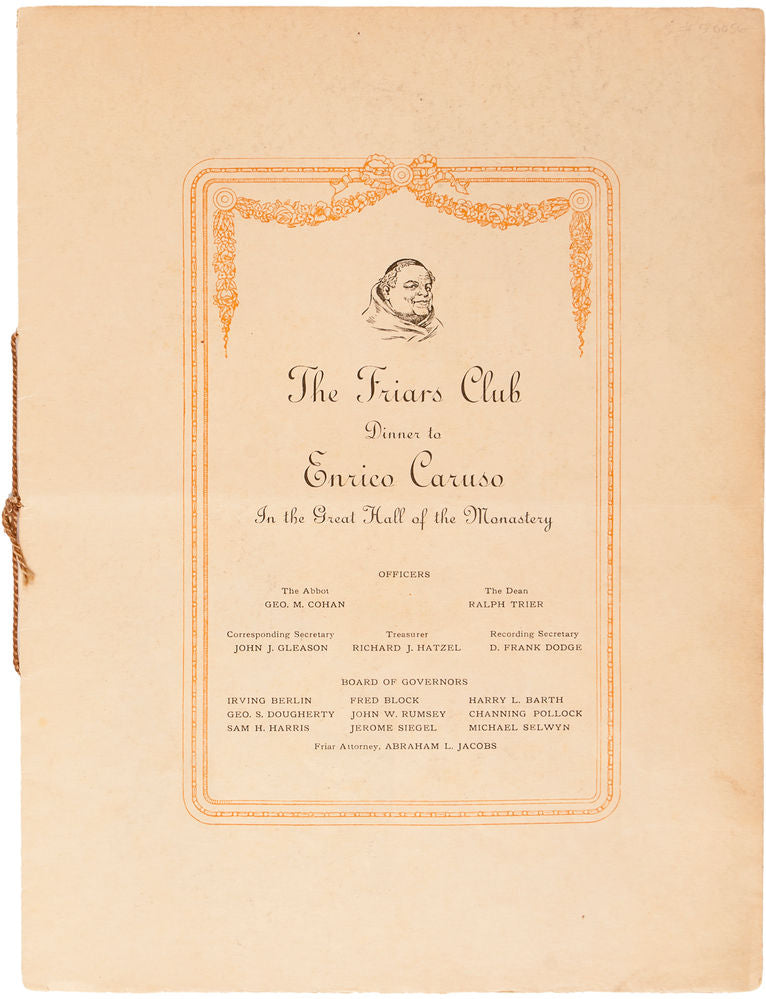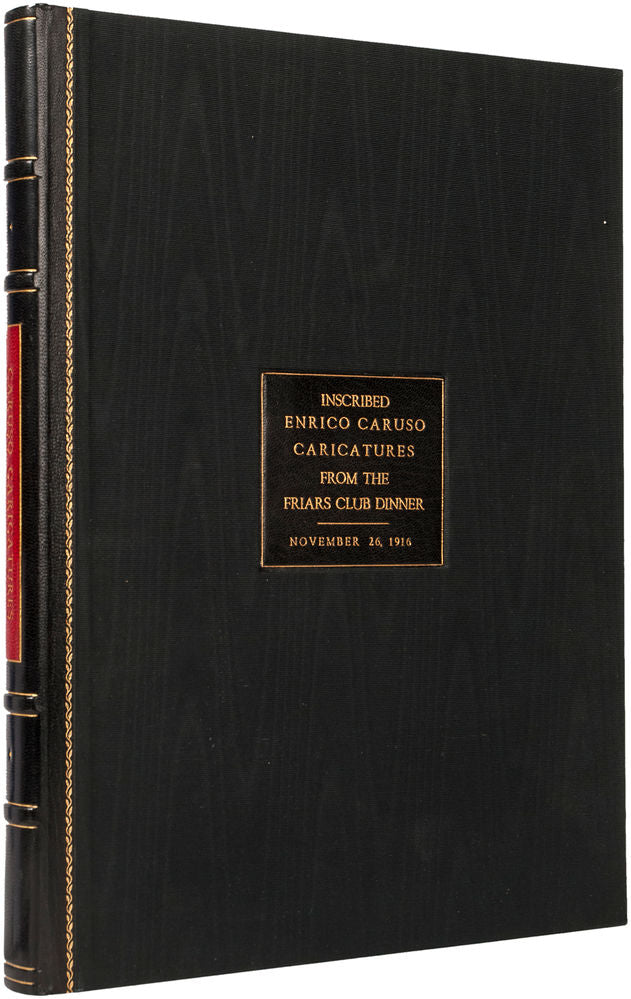 With a broadsheet, 220 x 305mm, printed for the event. On one side is a photographic portrait of Caruso surrounded by a collection of cavorting cartoon Friars by Ryan Walker. The reverse shows a printed cartoon of Caruso dancing on a grand paino by Hoban. This is inscribed in ink by Caruso ""To Pizzarello / Merry / Christmas / Enrico Caruso". Pale spotting and some minor edgewear, very good.