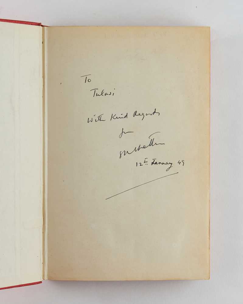 First edition, presentation copy signed and inscribed to one Tulasi, January 12, 1949, on front fly-leaf of the Indian Civil Servant's and short story writer's memoirs of his years from 1945 to 1947 as India's representative to Singapore under Lord Mountbatten, where he arranged Pandit Nehru's visit to meet the people of Indian origin in Malaya. It was also the first time that Mountbatten and Nehru had met. Chettur describes in detail Malaya, where he was concerned with the condition of the Indian workers, and southeast Asian cooperation in the reconstruction after the war.
