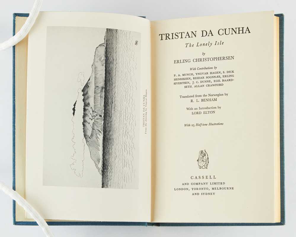 CHRISTOPHERSEN, Erling. Tristan da Cunha. The Lonely Isle … with contributions by P.A. Munch, Yngvar Hagen, S. Dick Henriksen, Reidar Sognnaes, Erling Sivertsen, J.C. Dunne, Egil Baardseth, Allan Crawford. Translated from the Norwegian by R.L. Benham. With an introduction by Lord Elton. London: Cassell. [1940].