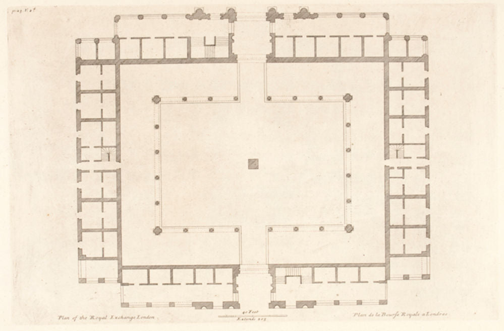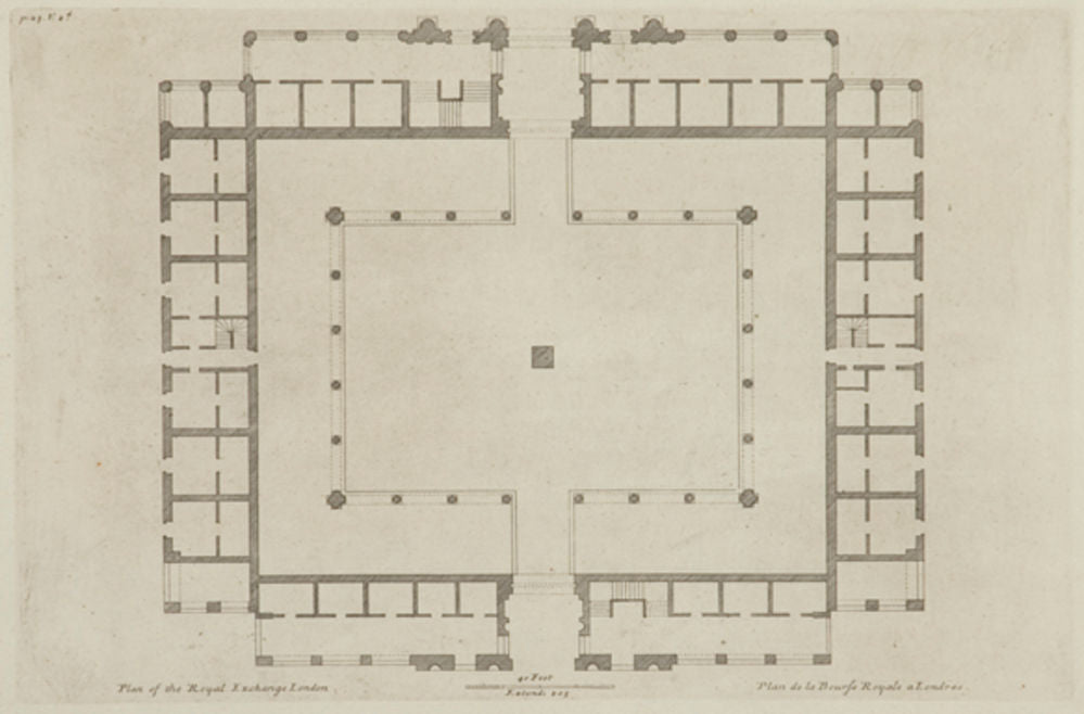 HULSBERGH, after Colen Campbell (1676-1729) Plan of the Royal Exchange London. An original engraving for 'Vitruvius Brittanicus or The British Architect' by Colen Campbell, second edition, published London 1731 360 x 555 mm. £40