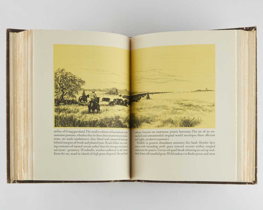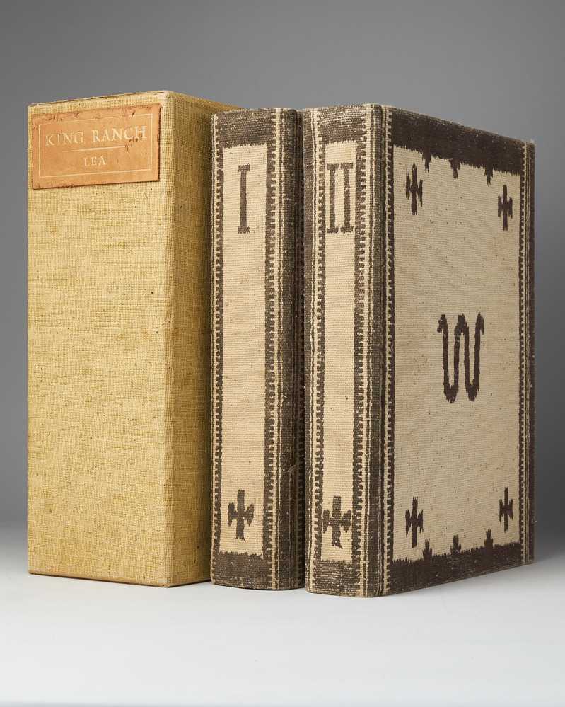 Two volumes, small 4to. Original full coarse linen printed with the running 'W' brand, being a facsimile of the saddle blankets woven and used on the King Ranch, patterned endpapers, rough fore-edges, the other edges sprinkled, in the original linen slipcase with gilt-stamped leather spine label; pp. [x], 467, [2]; [x], [469]-838, numerous plates, vignettes and maps (some in colour, printed with 'special inks') after drawings by Tom Lea, plus facsimiles of documents; slip-case a little marked, volume one with strengthened inner hinges; a very attractive set of a sumptuously produced book and an important association copy (see below).