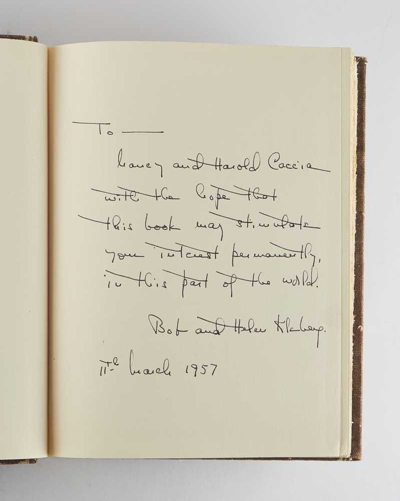 Provenance: Initial blank of volume one with 8-line cordial and calligraphic presentation inscription by the grandson of the founder and his wife (who commissioned Tom Lea to write, illustrate and design the book) to Harold Caccia. 'Robert J. Kleberg, Jr., and Helen C. Kleberg’s early lives were radically different, but their lifelong devotion and enduring love had a lasting impact on both King Ranch and the world beyond … Bob’s family had a long, rich history in South Texas. His grandfather was Captain Richard King, founder of King Ranch, and his grandmother was Henrietta Chamberlain, a Presbyterian minister’s daughter ... Bob and Helen’s legacy of philanthropy grew from a shared passion for cultural, civic, and environmental issues, which continues today through the establishment of their family foundation in 1950, the Robert J. Kleberg, Jr. and Helen C. Kleberg Foundation. The Foundation strives to continue their legacy by supporting and improving quality of life in South Texas communities, investing in scientific research and innovation, the arts and humanities, and wildlife and habitat stewardship'. The recipient of this set, Harold Anthony Caccia, later Baron Caccia, was a British top civil servant and diplomat who after the Suez crisis of 1956 had a lot to do in order to remedy the damaged Anglo-American relations and was instrumental in restoring and nurturing the 'special relationship' between London and Washington.