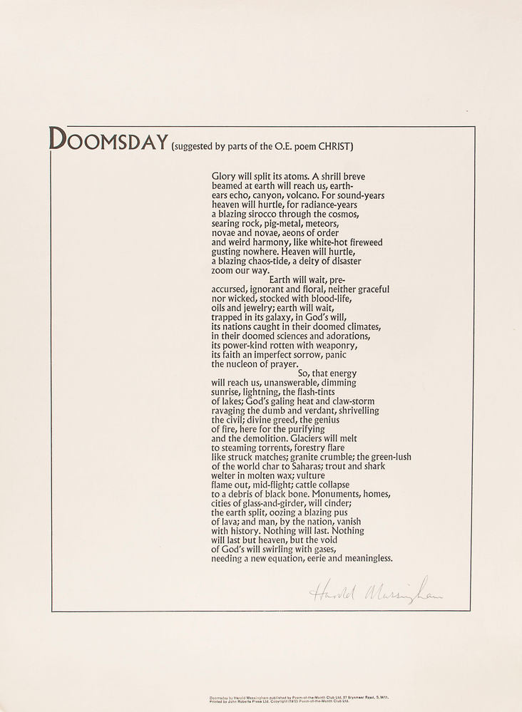 First edition thus, signed by the poet. Originally published as part of the 'Poem-of-the-Month Club' subscription service. This was the August Poem of the Month for 1972. With single A4 printed sheet explaining the poet's motivations for writing Doomsday , published contemporaneously with the poem.
