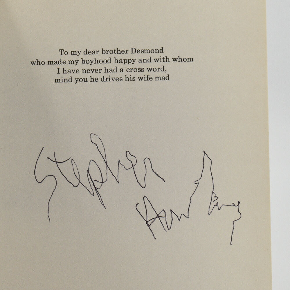 The occasion of this signing was extremely light-hearted. Hawkins was reading this copy of Milligan's book when Hawking commented on how funny the dedication was ("To my dear brother Desmond who made my boyhood happy and with whom I have never had a cross word, mind you he drives his wife mad"). In a sprit of joie de vivre and perhaps recognising that he would not be able to sign his name for much longer, Hawking scrawled his autograph beneath the dedication. It was the only example of his handwriting that existed in his friend's collection. At this point, Hawking had not written a full-length book and was far from being a household name, and so one would not expect an autograph on one of his own works; there are only a couple of verified Hawking signatures from this period, including his PhD thesis in 1965 and an archaeological book given to a departing colleague at the Institute of Astronomy in 1974. We don't expect to find a great scientist's signature in such an incongruous book. Yet it is a perfect representation of Hawking's famously anarchic sense of humour as well as a poignant suggestion that he knew his physical abilities were waning fast.