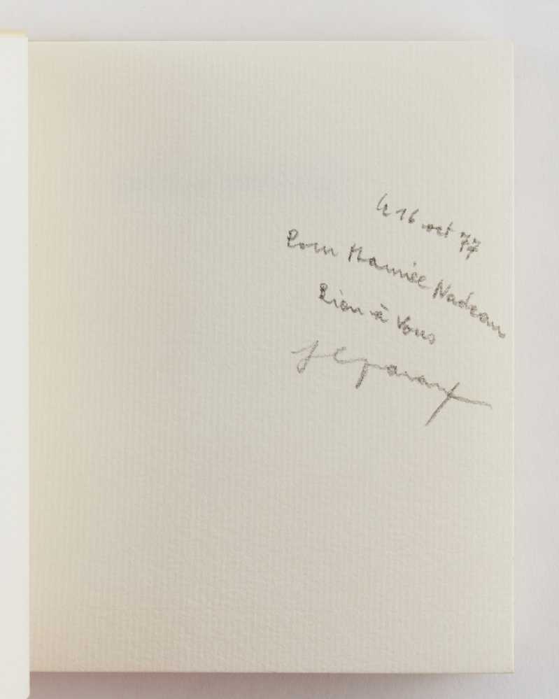 12mo. Soft cream covers lettered in blue and black. Les Xueyetêterret is a beautiful tribute to repetitive concrete poetry, transformed by Jean-Luc Parant’s singular, circular prose. The book features meticulously crafted typography and includes three original woodcuts by Jean-Luc and Titi Parant. This copy is numbered fty-six to the limitation page in pencil, and the book was limited to a print run of five hundred and fty copies. Also on the limitation page, there is the signature of Parant in pencil. To [p.3] there is also an inscription in pencil from Parant to the surrealist historian Maurice Nadeau who was one of the rst people to write on the Lettrist movement.