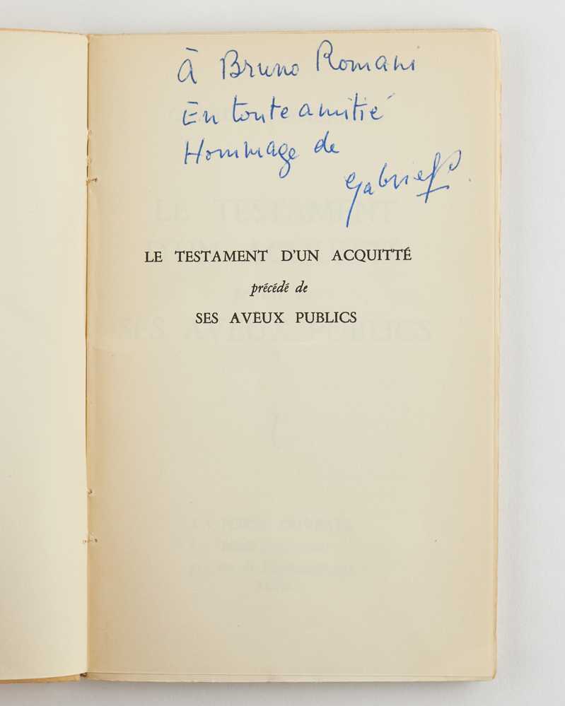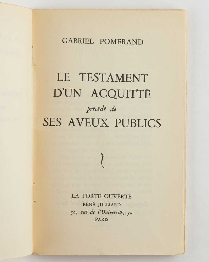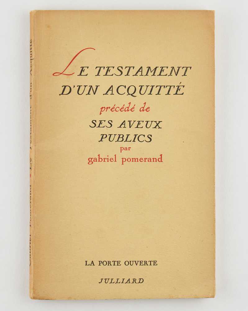 POMERAND, Gabriel. Le Testament d’un Acquitté: précédé de ses aveux publics [The Testament of an Acquitted Man: proceeded by his public confessions]. Paris: La Porte Ouverte René Julliard. 1951.