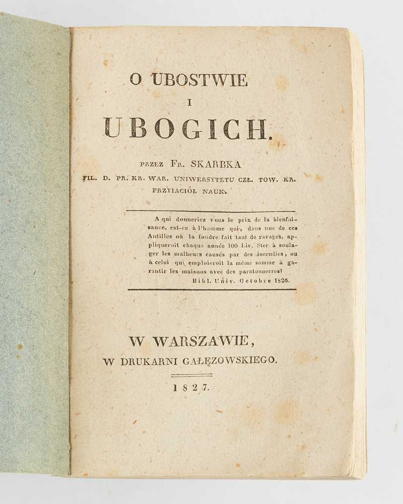 SKARBEK, Fryderik Florjan [Count]. O ubostwie i ubogich. Warsaw, Galezowski, 1827.