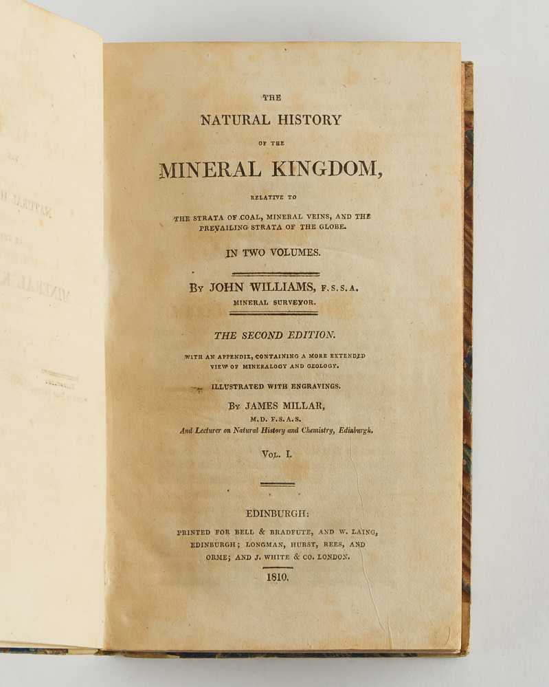 WILLIAMS, John. The Natural History of the Mineral Kingdom, relative to the strata of coal, mineral veins, and the prevailing strata of the globe. Edinburgh: Printed for Bell & Bradfute, and W. Laing. 1810.